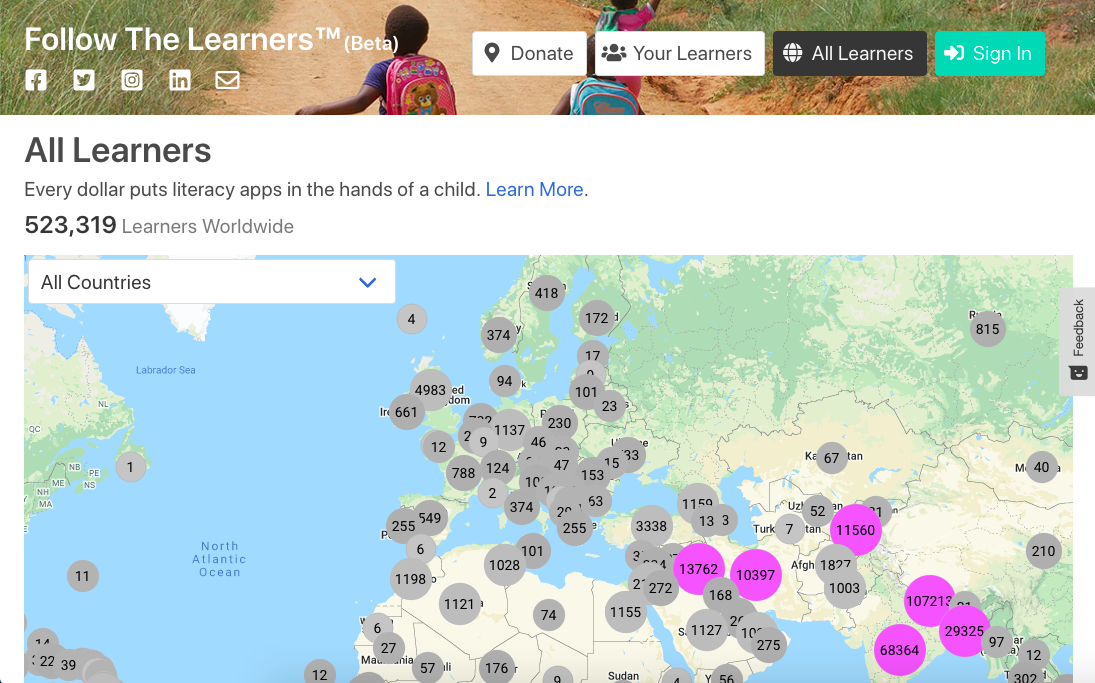Follow the Learners is a web application that allows donors to track the impact of their donations to Curious Learning's distrubition campaigns. By making a donation a donor will be able to see a representation of the users they helped aqcquire through ad-spend in the areas of the world they designated. I designed and developed the Cloud Firestore database that stores users and maps them to donations, as well as the logic that integrates the many moving parts of the app like donation logging through Stripe and user tracking with Firebase Analytics and Google Bigquery.