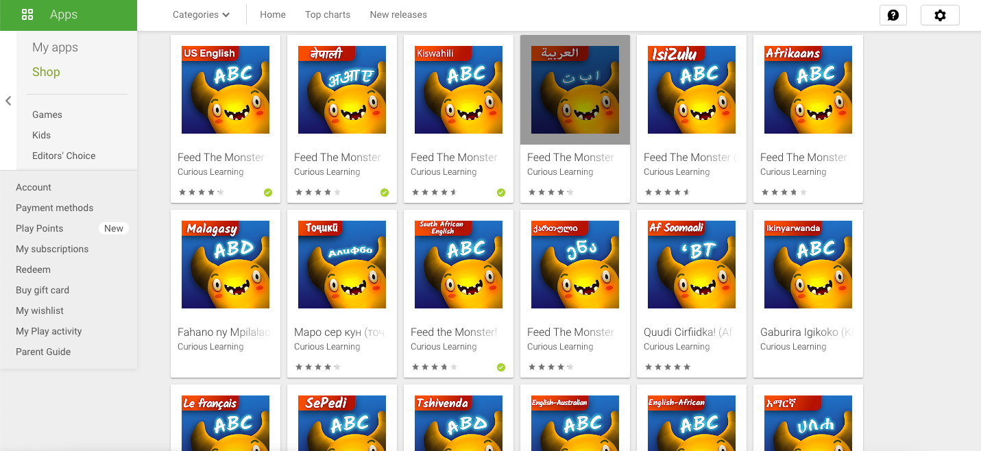 Feed the Monster was orginially an Arabic early reading app developed by CET for the Norwegian Agency for Development Cooperation (NORAD) as part of a call for open source educational apps to assist Syrian refugees. UNESCO and the team at Curious Learning saw the potential of the app's simple yet effective design and I worked quickly to develop a localization pipeline. We did not simply translate the app's content to different languages; We contracted native speakers and educators of each language to develop a scope and sequence of what children need to learn, and when. I wrote a script to use this information to generate game data for each language and writing system, and our visual artists re-generated the UI according to the original specifications. Diving into the code to discover the text and audio rendering pipelines was an exciting challenge, and after our initial successes we knew we were onto something big. I have sinced handed off the localization project to other developers, and recently we passed the milestone of over 50 different languages published on the Google Play Store.